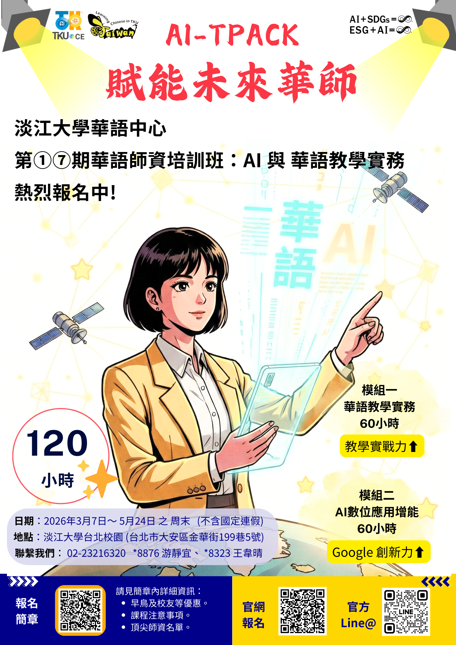 | 公告主旨 | 淡江大學推廣教育處華語中心辦理第十七期華語師資培訓班:AI與教學實務課程 |