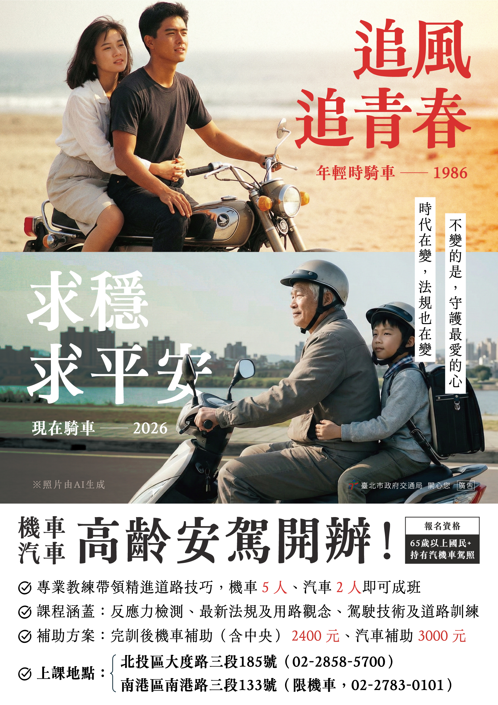 | 公告內容 | 高齡駕訓開班中,詳情請至北市交通局官網車輛駕訓補助專區查詢!