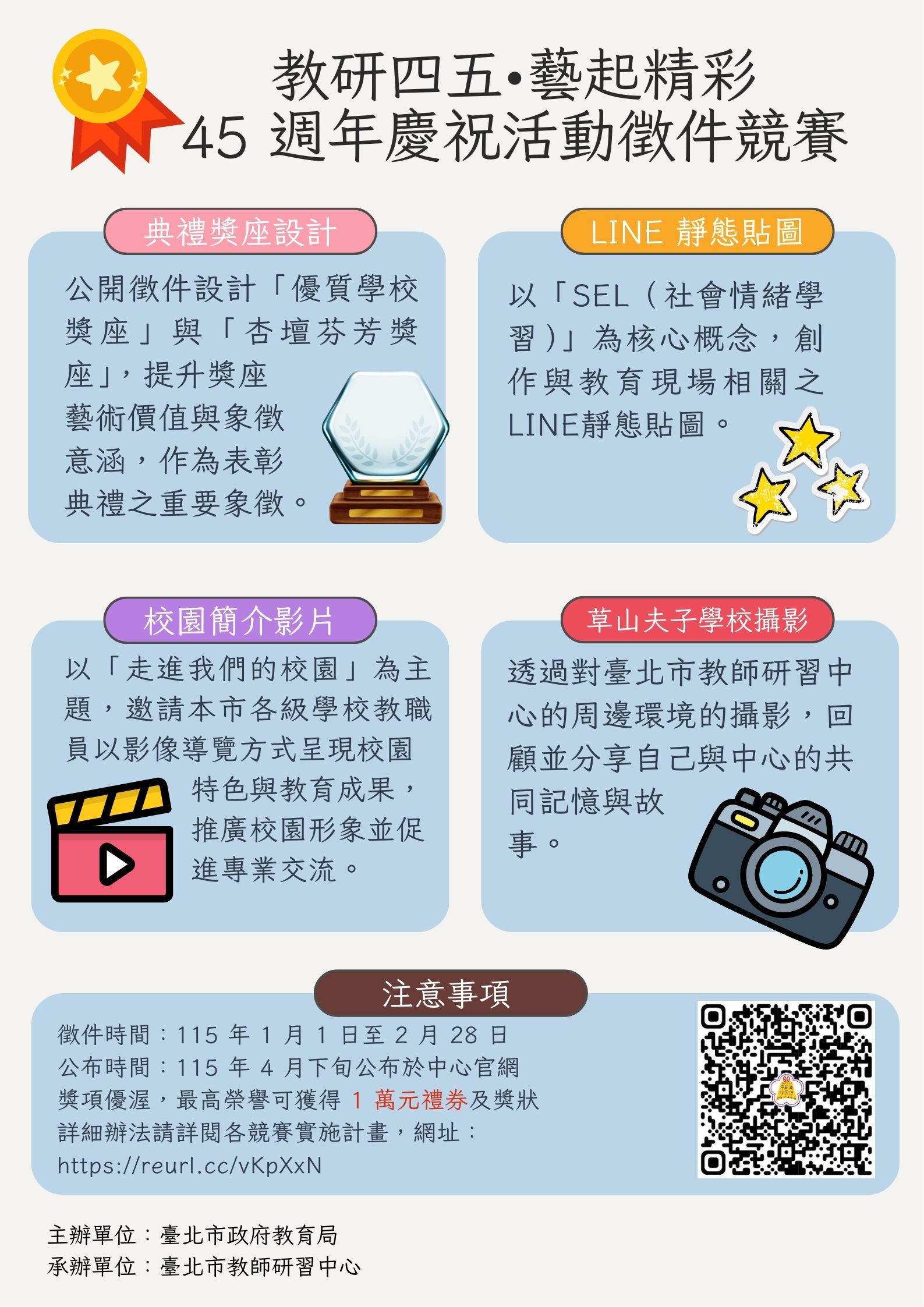 一、臺北市教師研習中心將於明年迎來創立45週年慶。為紀念此一重要里程碑,週年慶系列活動將回顧四十五年來的發展歷程與教育成果,並規劃多元慶祝內容。期盼藉此凝聚教育專業能量,共同開創教育的嶄新未來。配合本中心45週年慶,規劃辦理4項競賽活動,以凝聚教育專業能量並展現創新成果: