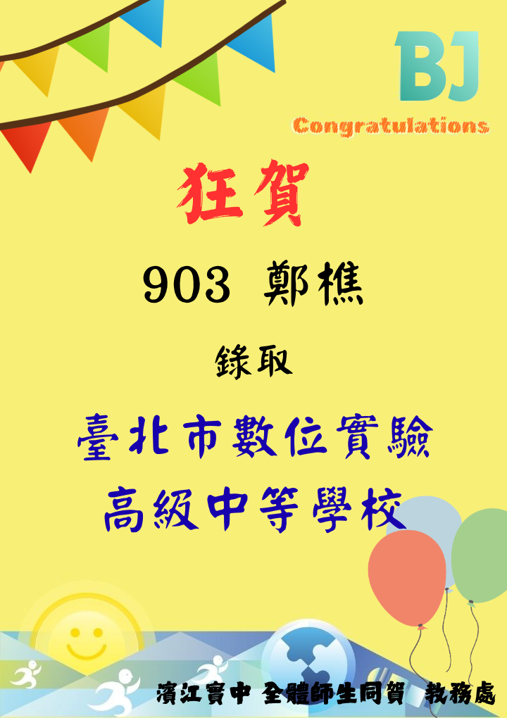 校園公告 公告主旨 賀本校903鄭樵同學錄取臺北市數位實驗高級中等學校 發佈日期 2026 年 4 月 28 日 發佈單位 註冊組 公告類別 榮譽榜, 濱江亮點 公告等級 賀 點閱次數 3 公告內容 相關附件 【2026-04-28】臺北市大安區銘傳國民小學有關「臺北市114學年度戶外教育及海洋 ... 【2026-04-28】本局Google Workspace for Education網域(@gs.tp. edu.tw)閒置 ...