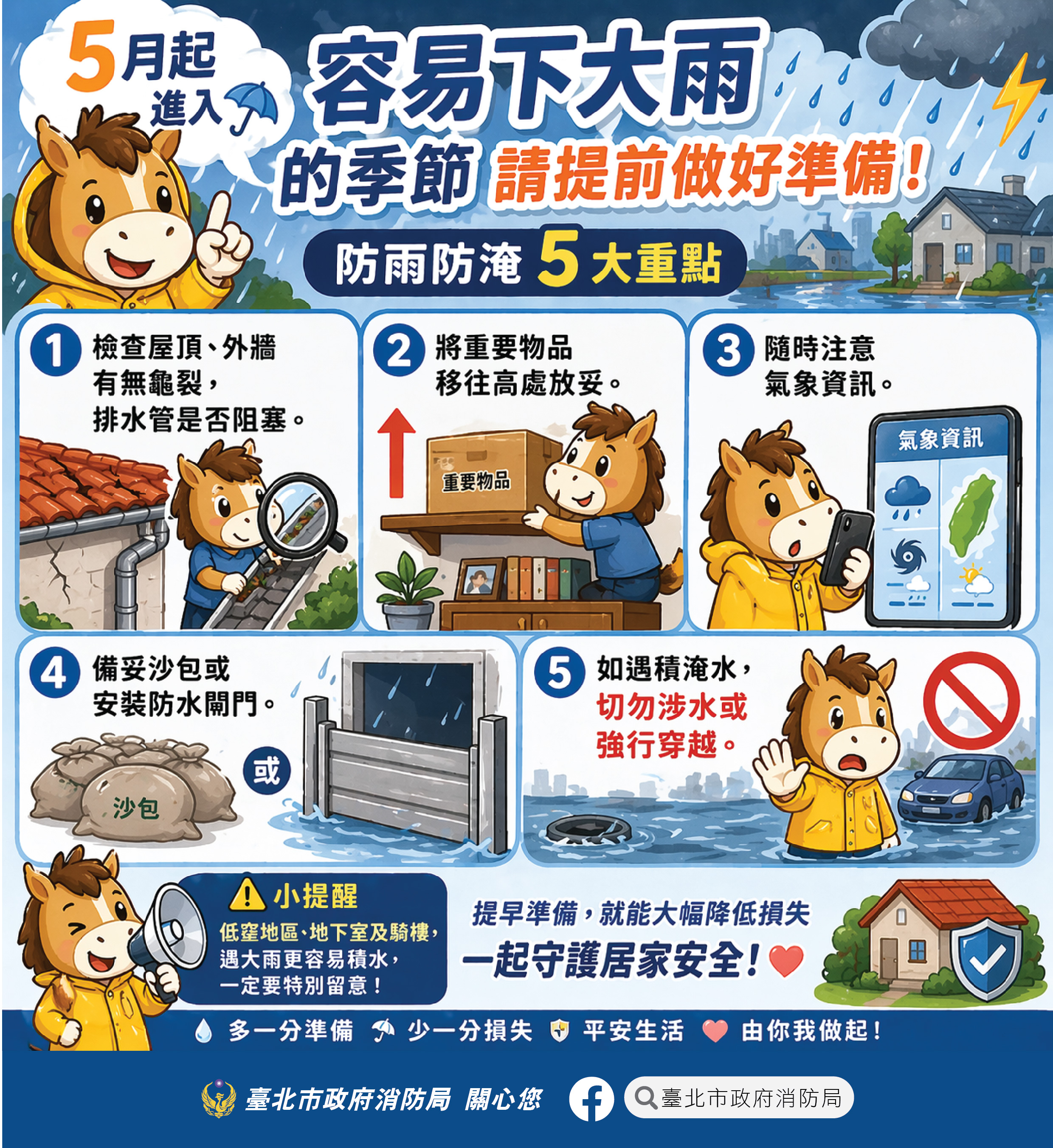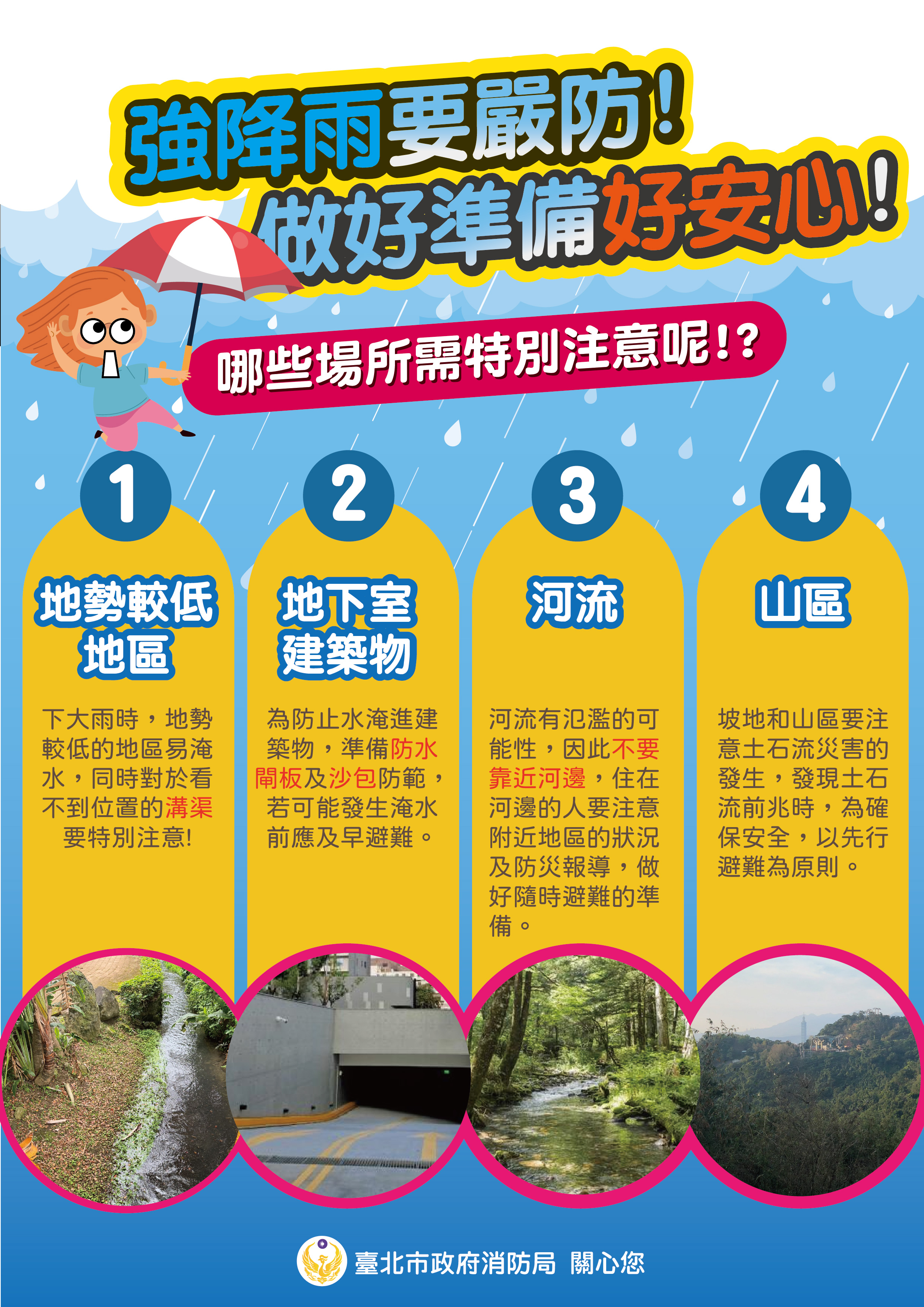 校園公告 公告主旨 轉知本市消防局防汛宣導素材與連結資料1份,請踴躍點閱並謹慎防災。 發佈日期 2026 年 4 月 29 日 發佈單位 生教組 公告類別 政令宣導 公告等級 轉知 點閱次數 3 公告內容 汛期即將來臨, 請民眾提前做好清淤排水, 注意氣象與災害資訊, 提高警覺。 若前往山區或河邊等地區, 應隨時注意環境變化, 如發現任何異常, 應馬上撤離, 以維生命安全。 相關附件 防汛宣導圖片2-強降雨 (1) 防汛宣導圖片2-強降雨 (1) 檔案名稱檔案大小檔案格式下載防汛宣導圖片2-強降雨 (1).jpg2.32 MB新視窗開啟檔案汛期5大重點-01.jpg2.36 MB新視窗開啟檔案 防汛宣導圖片2-強降雨 (1).jpg汛期5大重點-01.jpg 防汛宣導圖片3-積淹水怎麼辦 (1) 防汛宣導圖片3-積淹水怎麼辦 (1) 檔案名稱檔案大小檔案格式下載防汛宣導圖片3-積淹水怎麼辦 (1).jpg1.61 MB新視窗開啟檔案 防汛宣導圖片3-積淹水怎麼辦 (1).jpg 相關連結 經濟部水利署-馬克防汛篇(30秒) 【2026-04-29】馬偕護理專科學校為增進國中九年級學生及家長對「化妝品應用與管 ... 【2026-04-29】轉知「115年度515國際家庭日宣導及系列座談活動」