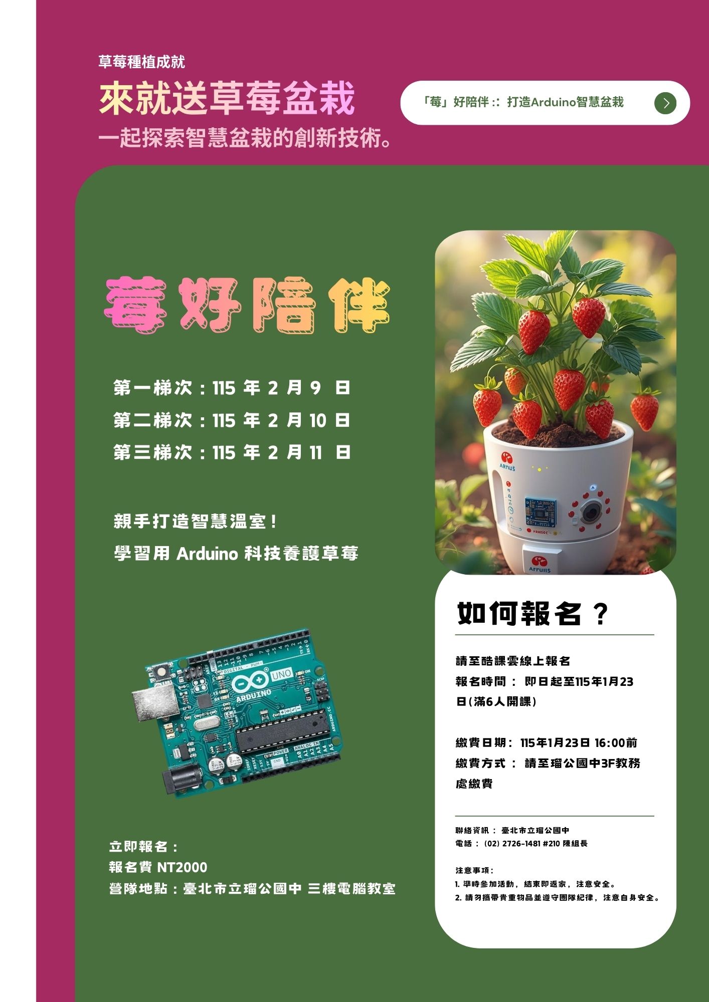 | 公告主旨 | 114學年度臺北市立瑠公國中寒假營隊-「莓」好陪 伴:打造Arduino智慧盆栽 |