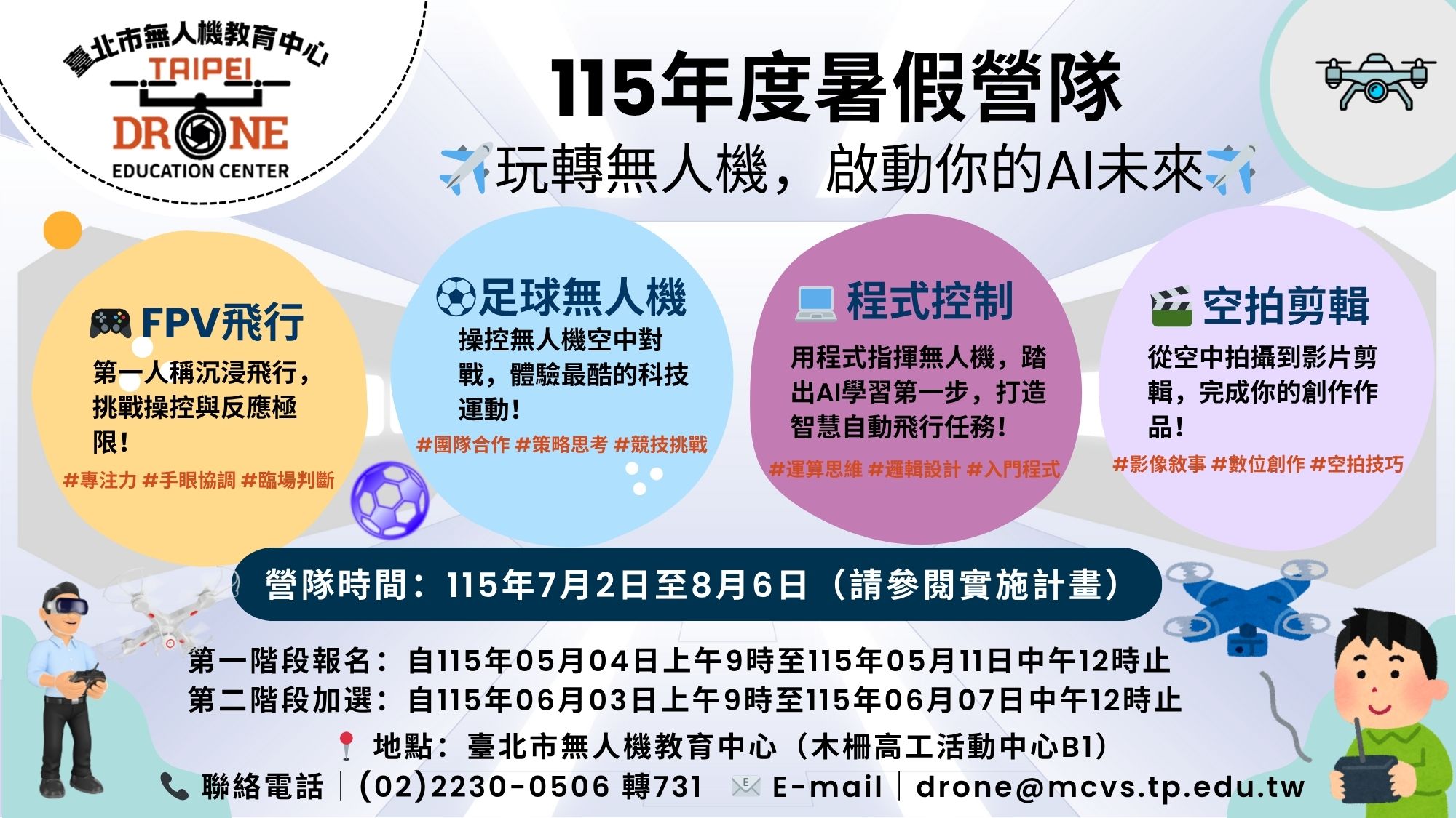 (一)營隊時間及地點:115年7月2日(星期四)至8月6日(星期四)假臺北市無人機教育中心教研教室(木柵高工活動中心 B1)。