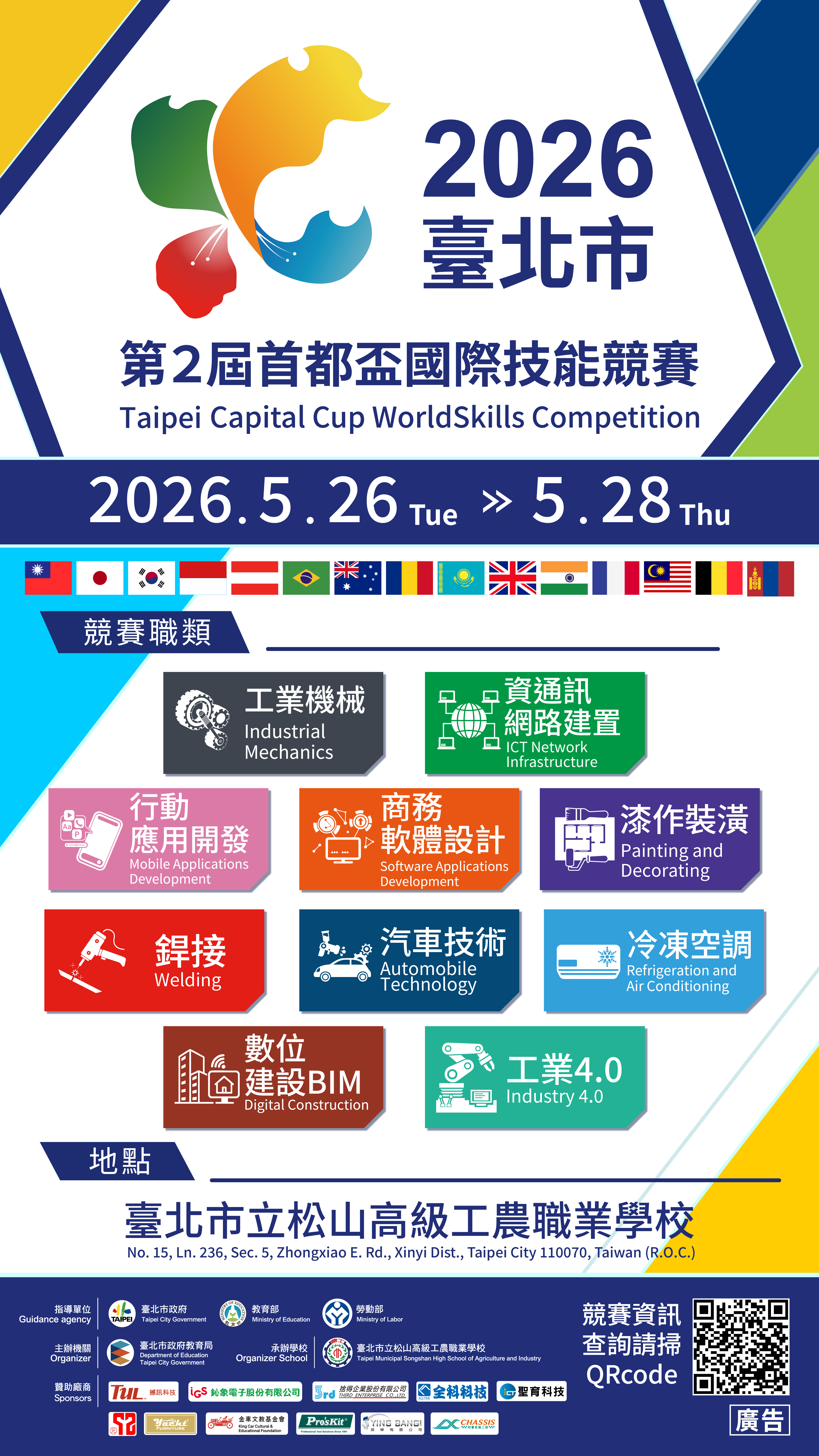 校園公告 公告主旨 2026臺北市第2屆首都盃國際技能競賽 發佈日期 2026 年 4 月 24 日 發佈單位 輔導組 公告類別 政令宣導 公告等級 無 點閱次數 11 公告內容 一、依據「2026臺北市第2屆首都盃國際技能競賽實施計畫」辦理。 二、本局為讓本國學生能與國際技藝選手相互交流切磋,於2026年5月26日至28日辦理第2屆首都盃國際技能競賽,競賽職類包含工業機械、資訊網路建置、行動應用開發、商務軟體設計、銲接、漆作裝潢、汽車技術、冷凍空調、工業4.0、數位建設BIM等10職類。 三、請參閱附件海報及點選宣傳影片。 相關附件 【2026-04-24】轉知-臺北市政府衛生局辦理「115年度認輔志工暨家長親職教育講座 ... 【2026-04-24】轉知-社團法人中華民國應用商業管理協會2026夏令營-高中企管營( ...